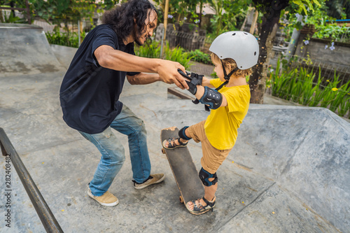 Athletic boy learns to skateboard with a trainer in a skate park. Children education, sports