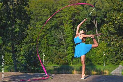 athletic girl jumping in nature with gymnastic ribbon. Girl dressed in blue dress freely, gymnastics ribbon pink