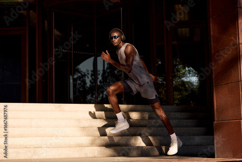 Athletic man running outdoors wearing headphones and sunglasses on urban stairs