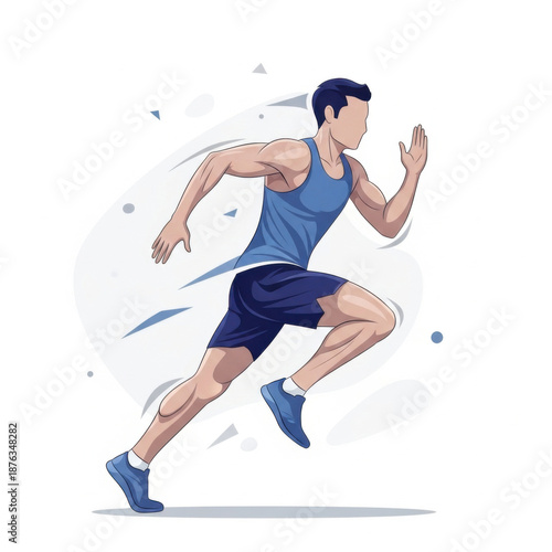athlete, runner, man, sprint, running, fitness, sport, training, timing, motion, movement, energy, dynamic, blue, tank top, short, shoe, activewear, cardio, speed, competition, stylised, illustration, digital artwork, exertion, sharpened, determination, health, exercise
