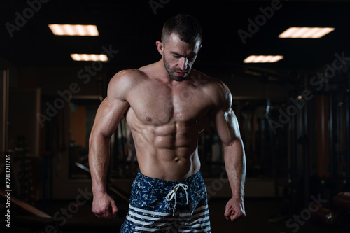 Athletic man with a muscular body poses in the gym, showing off his muscles. The concept of a healthy lifestyle