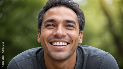man, athletic, smiling, squinting, young, closeup, green, foliage, tree, trunk, summer, background, crop, happy, nature, blurred, portrait, outdoors, sunlight, facial expression