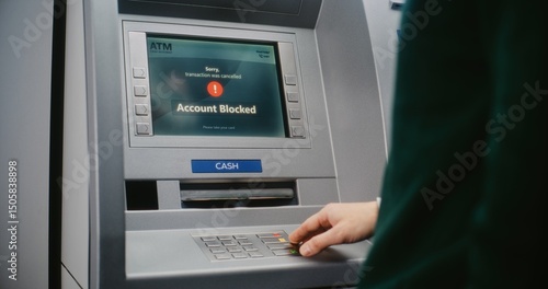 ATM User Entering PIN Code on ATM Keypad for Money Withdrawal. Error Message on Cash Machine Screen About Cancelled Transaction Due to Blocked Bank Account. Cash Transactions, Banking System. Close Up