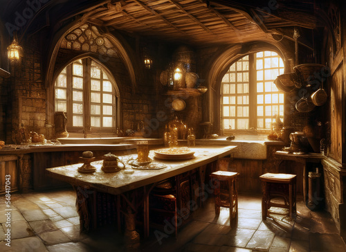 atmospheric painting of an old tudor period hall kitchen with jars on shelves and pans hung on walls and a wooden table with food in morning sunlight. generative ai art