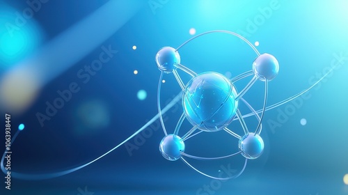 Atom and molecule visualization in blue, representing research and medical science, set against a sleek abstract background.