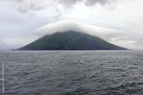 Atsonupuri Volcano of Iturup island, the Sea of Okhotsk, Kuril Islands, Russia, claimed by Japan. The top of volcano hidden in fog.