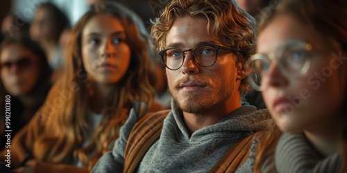 audience, people, man, woman, goggles, group, lecture, presentation, conference, event, education, attentive, focused, serious, listening, learning, classroom, student, gathering, seminar, workshop, indoor, meeting, speaker, dais, stage, university, college, school, business, professional, casual attire, portrait, portraiture, close, up, selective, sharpened, natural, light, bright, background, blurred, soft, young, adult