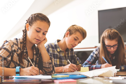 teenage, open, to sit, girl, paper, notebook, write, concentrated, boy, listen, see, school, female, light, learn, curiosity, look, hold, lesson, attention, modern, male, neighboring, television, classmate, pupil, young, device, contraption, interest, serious, round, study, comfort, convenient, glance, sight, desk, classroom, interactive, indoor, atmosphere, caucasian, room, information, take, tied-up, intent