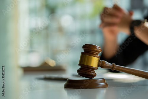 Attorney's office working on papers and hammer with scales of justice on the table.