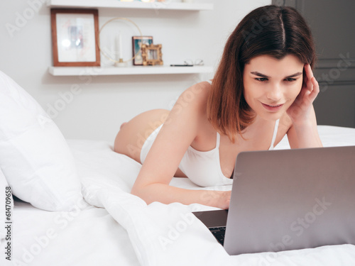 Attractive and relaxed seductive young woman wearing white underwear and robe. Sexy smiling mode in bedroom at home in in lingerie. Female in sunglasses in bed. Using notebook, laptop, computer