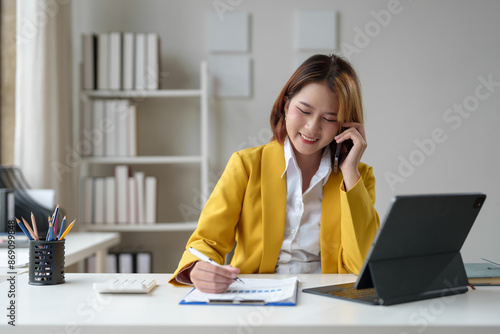 Attractive Asian business woman Use laptop to view computer and talk on mobile phone, contact financial business online. Conduct discussions and contact customers startup business idea.