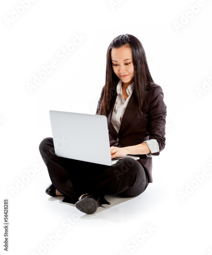 cheerful, adult, asian ethnicity, beautiful, beauty, black hair, business, businessperson, business suit, businesswoman, computer, copy space, cross-legged, cut-out, cute, electronic mail, elegance, female, full-length, happiness, cyberspace, isolated, isolated on white, joy, laptop, one person, people, posing, professional occupation, satisfaction, sitting, smiling, studio shot, success, white, white background, woman, young adult, missy