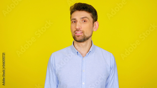 face, man, open, mouth, teeth, yellow, background, bearded, male, photogenic, portrait, studio, white, attractive, guy, looking, stylish, model, person, business, coiffure, copy space, european, thinks, adult, beard, indoor, hair, look, light, blue, shirt, place, text, product