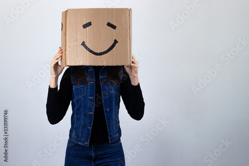 attractive caucasian middle age woman model with a box on the head and a smile mark, isolated on gray background studio shot, black sweater, denim jacket, jeans, dark air. Place for your text in copy