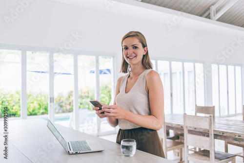 woman, freelance, phone, surfing, using, cheerful, home, modern, smartphone, laptop, mobile, workspace, bali, casual attire, connection, attractive, remote, notebook, online, business, mobile phone, wireless, working, intelligence, communication, entrepreneur, desk, technology, device, speaking, successful, education, alone, morning, happy, contraption, computer, interior, table, adult, men at work, chatting, work, female, copy space, indoor