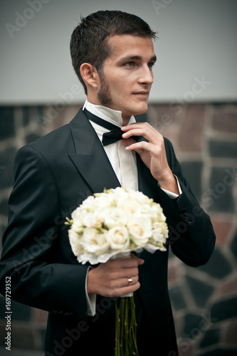 Attractive groom with whiskers adjusts his bow tie while holding wedding bouquet in another hand