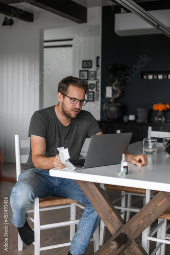 attractive nerdy man with glasses freelance working from home during the covid pandemic or flu