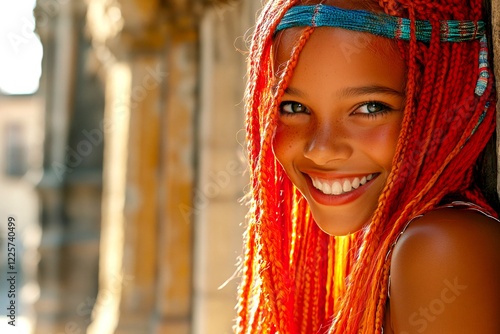 Attractive smiling mixed-race girl - for ads, billboard and social networks use. Long hairdo - braids hair. Commercial promotion visual idea. Long colored hair model. African model concept.