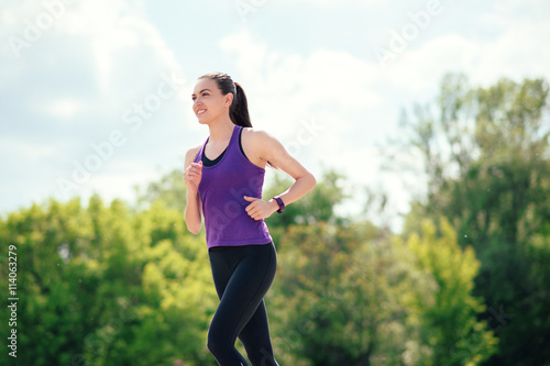 Attractive sporty woman running in park. Happy face. Sunny day for sport.