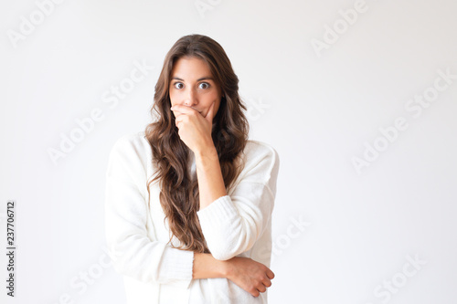 Attractive surprised Latin girl covering mouth. Beautiful elegant young woman touching lips with hand. Isolated on white. Shock concept