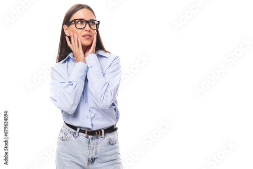 attractive well-groomed young brunette caucasian woman in glasses is dressed in a sky blue shirt on a white background with copy space