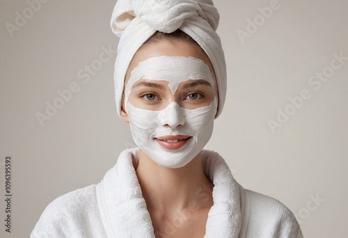raw, photo, style, create, illustration, attractive, woman, slimmer, smile, white, towel, wrapped, around, her, head, wearing, pale, beige, beauty, face, mask, fluffy, bathrobe, against, background, professional, modern, commercial, eye-catching, ultra, realistic, highly, detailed