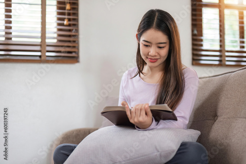 Attractive young Asian woman sleep in the minimal and comfortable living room enjoying reading a book