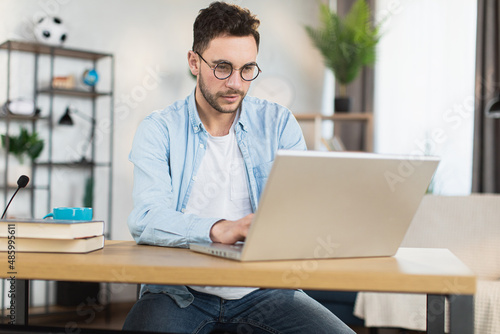 Attractive young man in eyewear and casual clothes sitting at domestic workplace and using modern laptop for work. Concept of people, technology and freelance.