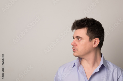 man, face, copy space, portrait, business, fashion, positive, emotional, caucasian, young, casual attire, attractive, smiling, european, intelligent, brown, smile, male, adult, person, background, standing, cheerful, 1, guy, confident, studio, looking, camera, grey, successful, model, isolated, photogenic, smart, happy, friendly, people, style