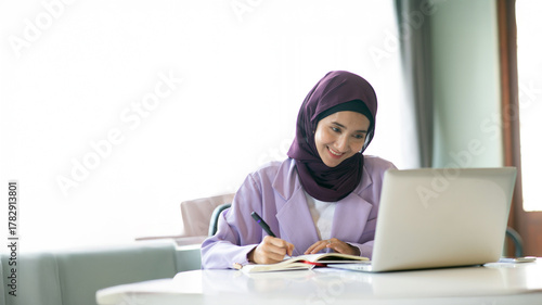 Attractive young Muslim woman is using her laptop and smartphone to plan her business structure and sell products online, shopping online, Banner Online, Copy space.