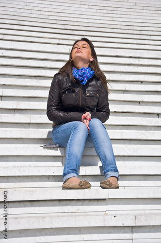 girl, young, woman, beautiful, attractive, cute, delightful, sit, stare, smile, jacket, jean, white, one person, people, foulard, basking, sun, sunbathe, enjoy, blue, emotion, mood, light, stair, marble, stone, spring, foot, leather jacket, street, urban scene, daylight