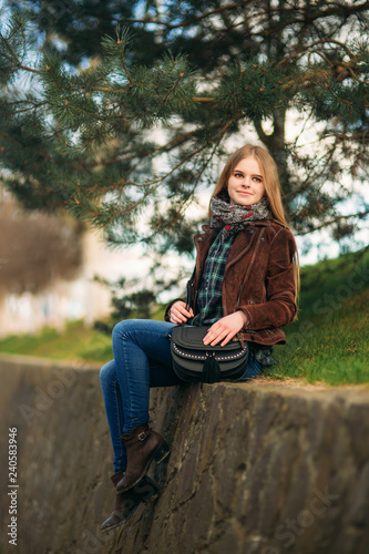 Attrective young girl sits by the embankment. Blond hair and brown jacket. Spring