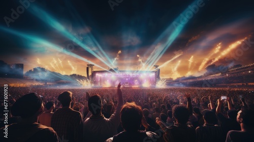 Audience at an outdoor concert at stadium arena, Vibrant color.