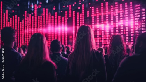 Audience Observing Financial Data on Digital Display in Red Lights