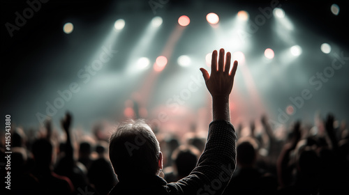 Audience Raising Hands at a Live Music Concert with Dramatic Stage Lighting and Energetic Atmosphere