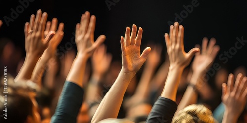 Audience raising hands in a darkened room