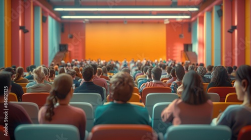 Audience seated in a colorful auditorium attentively watching a presentation, showcased in a vibrant setting with rows of chairs.