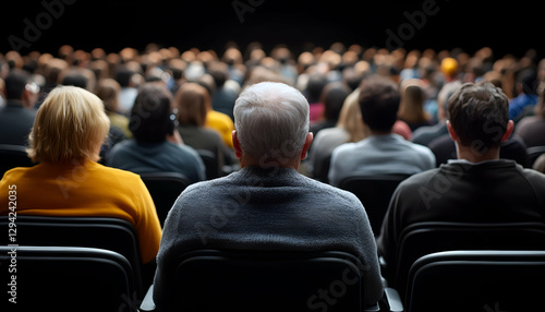 audience, auditorium, presentation, lecture, seminar, conference, meeting, crowd, people, spectator, theatre, cinema, hall, venue, seat, chair, back, view, watching, listening, show, event, gathering, assembly, performance, concert, speech, speaker, stage, dark, room, lighting, backstage, perspective, rear, sitting, group, together, public, massa, observe, view, attend