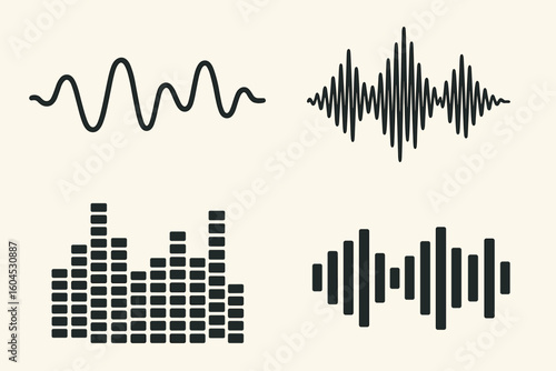 audio, wave, sound, music, equalizer, waveform, vector, icon, set, signal, spectrum, illustration, graphic, symbol, frequency, digital, technology, voice, rythm, design, element, collection, black, abstract, player, interface, amplitude, beat, volume, radio, podcast, track, song, vibration, line, curve, bar, chart, pulse, modern, simple, flat, isolated