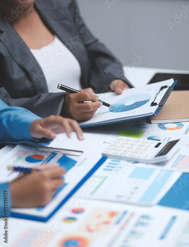 Auditor and accountant team working in office, analyze financial data and accounting record with calculator. Accounting company provide finance and taxation planning for profitable cash flow.