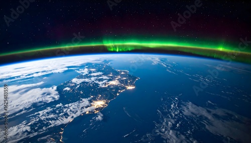 aurora borealis, aurora borealis, earth, night, space, planet, atmosphere, celestial, cosmos, universe, glowing, green, sky, star, city lights, cloud, ocean, outer space, natural phenomenon, astronomy, science, exploration, discovery, wonder, beauty, inspiration, serenity, peace, calmness, dark, illuminated, horizon, curvature, orbital, vibrant, colourful, dynamic, aethereal, fantasy, dreamlike, scenic, immensity, awe, magnificent, spectacular, global, environmental