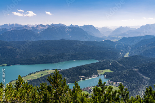 Aussicht auf den Walchensee und die Alpen in Oberbayern vom Gipfel des Herzogstand