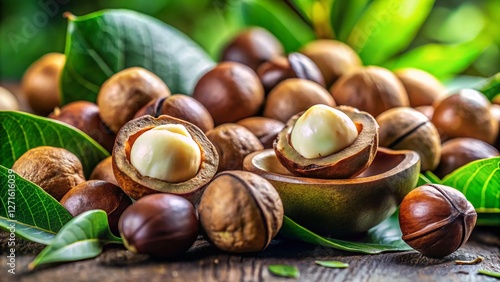 Australian Macadamia Nuts: Whole & Peeled with Fresh Green Leaves - Tilt-Shift Photography