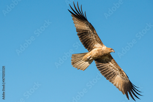 australian, bird of prey, soaring, clear, blue, sky, animal, bird, brown, aerial view, flying, beak, wildlife, animal, wing, flight, eagle, tail, clear sky, claw, predator, bird of prey, high altitude, hawk, wild bird, gliding