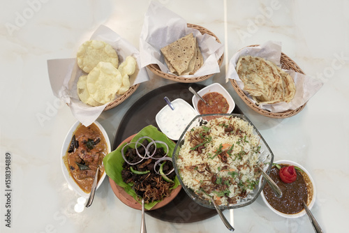 Authentic South Indian Meal with Biryani, Chicken Curry, Beef Fry, Beef Curry, Porotta, and Chapathi