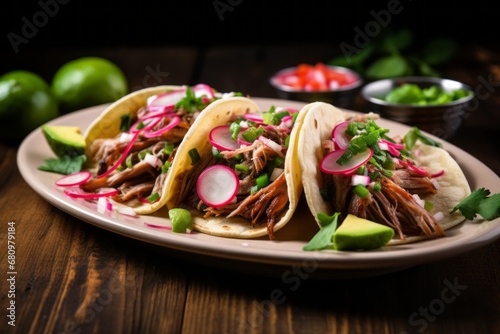 Authentic street tacos featuring slow-cooked Mexican pork carnitas, a flavorful and savory delicacy