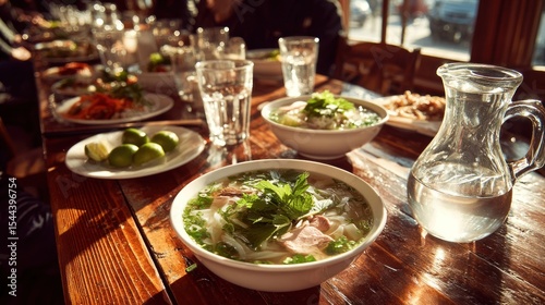 pho, vietnamese, soup, noodle, cookery, dish, food, asian, broth, fresh, lime, herb, healthy, delicious, eatery, dinner, lunch, bowl, table, wooden, glasses, water, pitcher, meal, traditional, tasty, epicure, vietnam, culture, eat, greener, dining, gastronomy, oriental, nourishment, culinary, ingredient, flavorful, serving, ethnicity, seasoning, vegetable, refreshment