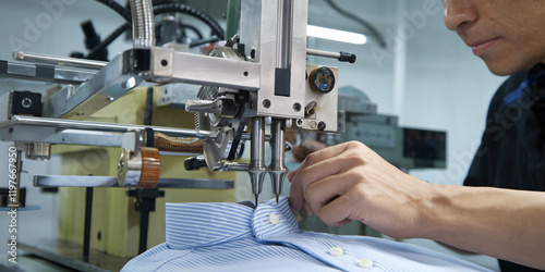 textile, manufacturing, industry, sewing, machine, buttons, shirt, automated, factory, men at work, hand, fabric, closeup, production, garment, industrial, technology, automation, process, precision, detail, equipment, operation, operator, blue, striped, collar, clothing, craftsmanship, efficiency, massa, tailor, tailoring, dressmaking, fashion, apparel, manufacture, needle, thread, stitch, work, workplace, job, skill, skilled, labor, professional, business