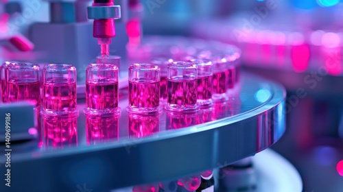 automated, laboratory, liquid, container, pink, chemical, processing, machinery, equipment, science, research, technology, manufacturing, production, sample, testing, analysis, experiment, pharmaceutical, medicine, machine, robotic, automation, experimentation, biotechnology, fluid, chemical, solution