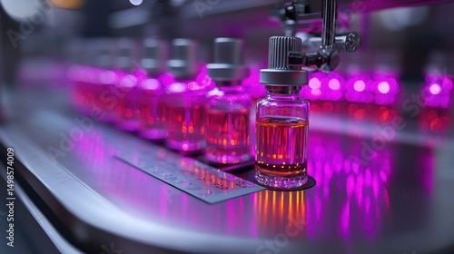 ampoule, liquid, medicine, pharmaceutical, assembly line, assembly line, automation, stainless steel, manufacturing, factory, laboratory, ruler, closeup, sharpened, out of focus, blurred background, machinery, precision, calibration, technology, industry, industrial, pharmaceutical